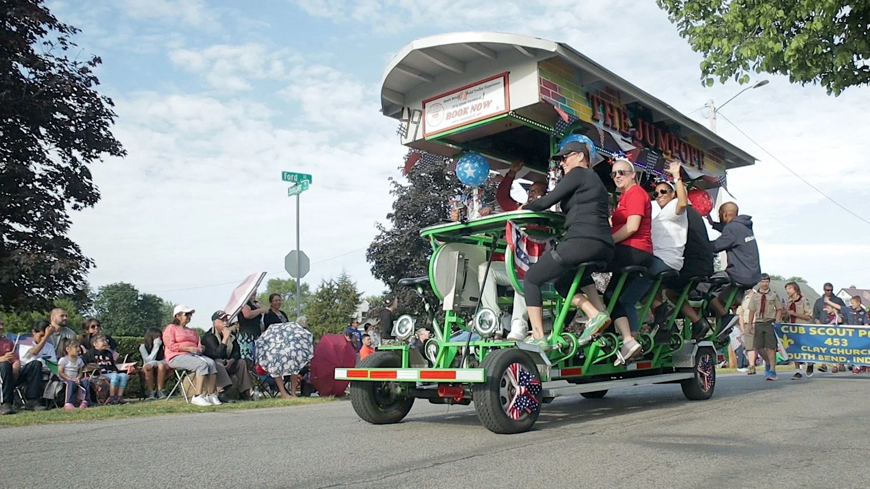 The Jumpoff is South Bend’s first pedal trolley. Since its debut in May, the bright green foot-powered vehicle has been an eye catcher in parades, at art fairs, and on the streets of downtown.